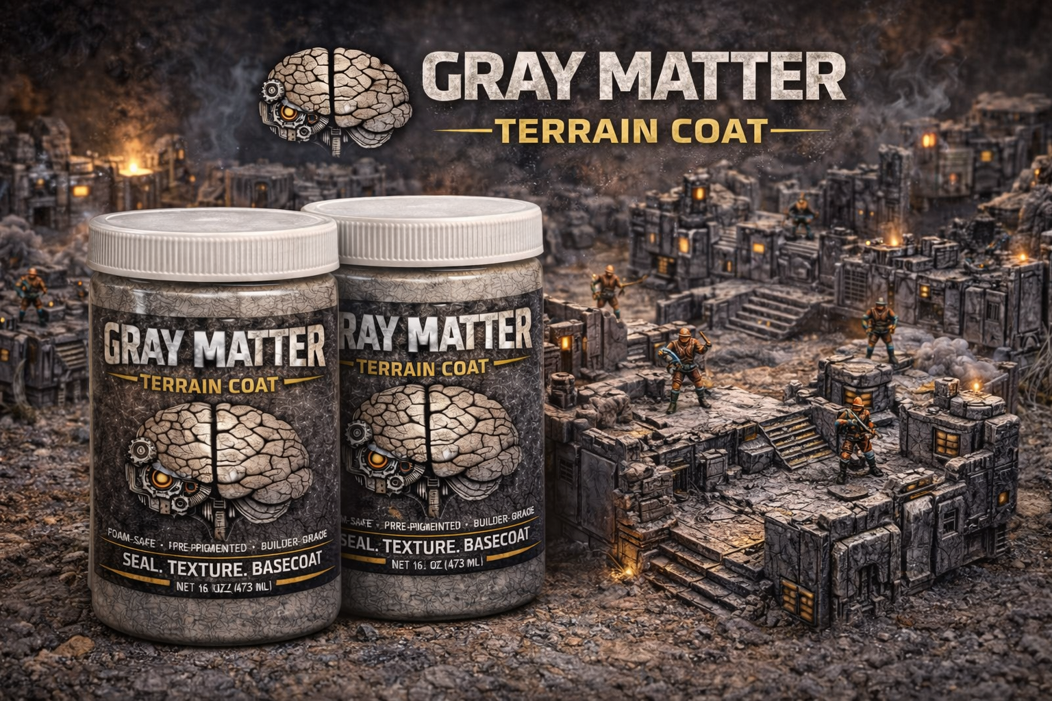 Terrain building should be fast, repeatable, and fun — but sealing foam, locking texture, and basecoating turns into a multi-product mess. Gray Matter is a one-pass terrain coat: seal + texture + neutral base, so you can paint sooner and waste less time.